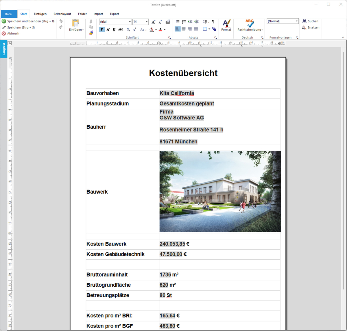 Die Ausgabe der Kostenermittlung ist die Visitenkarte des Planungsbüros. Ein optisch ansprechendes und frei gestaltbares Deckblatt im Corporate Design des Büros oder des Auftraggebers gehört dazu. Es dient der Darstellung aller notwendigen Informationen zur Baumaßnahme sowie der Zusammenfassung der Kostendetails auf den ersten Blick. Die G&W Software AG setzt diesen Kundenwunsch in ihrem AVA- und Baukostenmanagementsystem „California“ mit der Version 13 um. So können Planer ab sofort in allen Kostengliederungen, Raum- und Gebäudebüchern, aber auch den Dokumentationen vor die eigentlichen Kostendaten Deckblätter voranstellen. Der Inhalt ist optisch und inhaltlich frei gestaltbar. Dazu bearbeiten die Architekten oder Ingenieure das Deckblatt mit der aus der LV-Textbearbeitung bekannten Textverarbeitung „Textpro“. Eine Ablage von Mustervorlagen sowie die Kopie von Deckblättern in andere Bauvorhaben sind jederzeit machbar. Neben freiem Text, Tabellen und Fotos sind auch Abrufe aus der California-Datenbank und Rechenfelder machbar. Planer können die Kosten bspw. der Konten 300 und 400 (Bauwerk und Gebäudetechnik) sowie den Bruttorauminhalt und die Bruttogrundfläche aus der Kostenermittlung nutzen, um die Kosten pro Kubikmeter umbautem Raum oder pro Quadratmeter Bruttogrundfläche auszugeben. Deckblätter lassen sich sowohl in der Kostenermittlung (im Planungsordner) als auch in der Kostendokumentation anlegen.