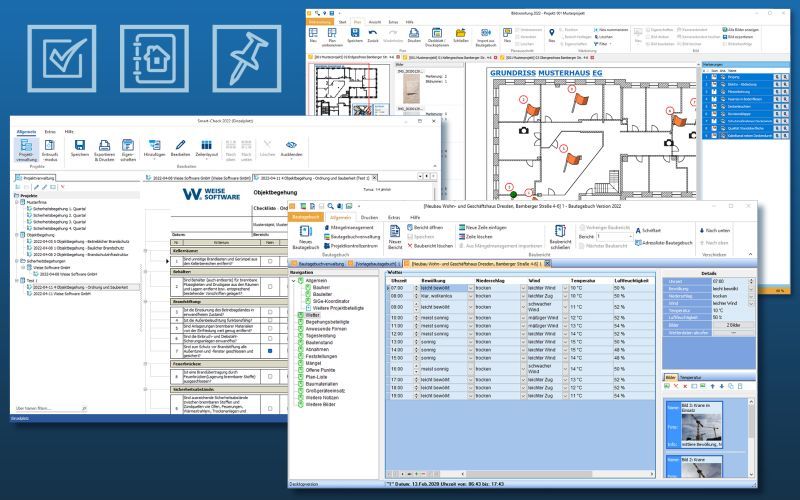 08.07.2022Mit den Programmen „Smart-Check 2022“, „Bildverortung 2022“ und „Bautagebuch 2022“ präsentiert Weise Software drei Anwendungen, die jeweils über eine zusätzliche App für Android sowie iOS verfügen und damit sowohl im Büro als auch unterwegs auf Tablets und Smartphones eingesetzt werden können.