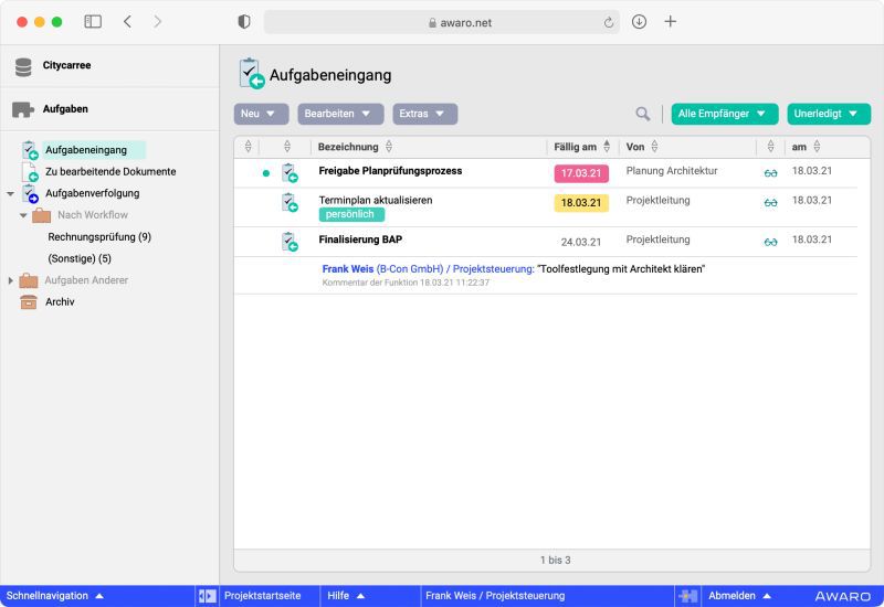 Aufgaben einfacher bearbeiten und verfolgen 21.05.2021Ein Schlüssel für erfolgreich durchgeführte Bauprojekte ist das reibungslose und effiziente Zusammenspiel aller Beteiligten. Daher verbesserte die AirITSystems das Bearbeiten und Verfolgen von Aufgaben und Workflows in ihrem webbasierten Projektraum „Awaro“.