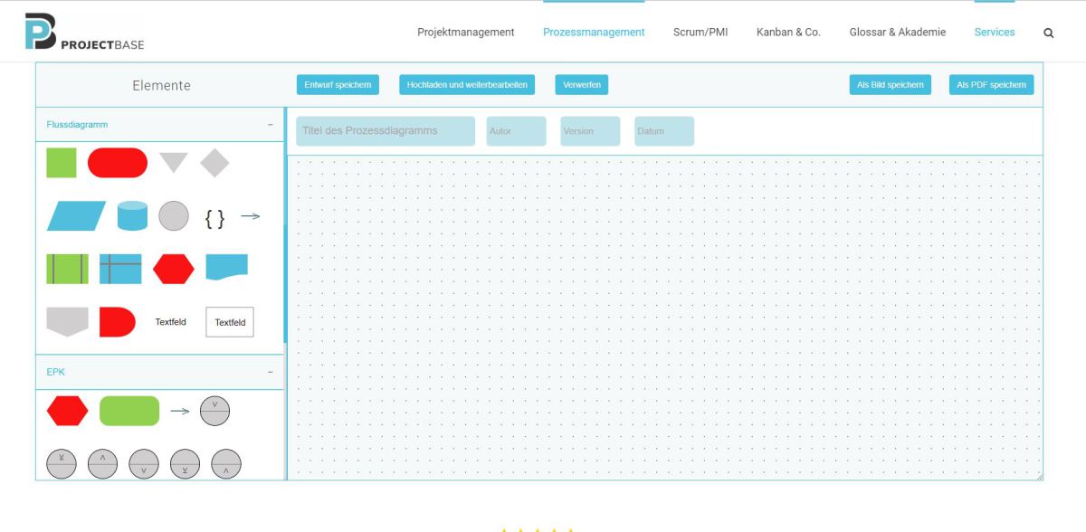 Kostenlose Webapplikation 13.01.2022Die multimediale Internet-Plattform Project Base unterstützt ihre Anwender rund um die Themen Prozess- und Projektmanagement. Seit kurzem gehört die kostenlose Webapplikation "IQProcess" zur Prozessmodellierung zum Angebot. Damit sind individuelle Flussdiagramme und ereignisgesteuerte Prozessketten (EPKs) inklusive der erweiterten Variante (eEPK) schnell und einfach zu erstellen. Eine Anmeldung, Installation oder ein vorheriger Download sind nicht nötig.