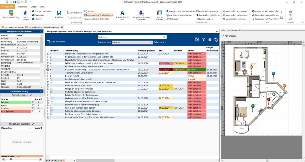 Darüber hinaus können Projektverantwortliche über die im Programm integrierte Synchronisierungsfunktion die Webplattform mit der Desktopanwendung abgleichen. Mit dieser neuen, webbasierten Mängelmanagement-Lösung haben Projektverantwortliche jederzeit eine Kontrolle über den aktuellen Bearbeitungsstand und können den Status des jeweiligen Mangels nach Abschluss, Prüfung und Abnahme aller Arbeiten auf „Behoben“ setzen und damit erfolgreich abschließen, beschreibt das Softwareunternehmen.