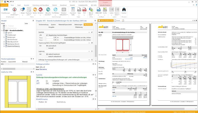Nach entsprechender Dateneingabe stellt die Software eine vollständige und prüffähige Ausgabe des Nachweises der Tragfähigkeit unter Brandbeanspruchung zur Verfügung. Dies beinhaltet alle für den Prüfer relevanten Informationen sowie die Option auch Zwischenergebnisse zur besseren Nachvollziehbarkeit auszugeben. Neben dem Brandschutz durch Feuerverzinken bemisst das neue Baustatik-Modul auch ungeschützte („schwarze“) Stähle sowie Brandschutzmaterialien wie Verkleidungen und Spritzputze. Hierdurch ist eine direkte Vergleichbarkeit zwischen den verschiedenen Brandschutzlösungen gegeben. Die Nutzung des neuen Moduls S855.de ist übrigens auch durch Ingenieurbüros möglich, die bisher nicht mit mb-Software arbeiten.
