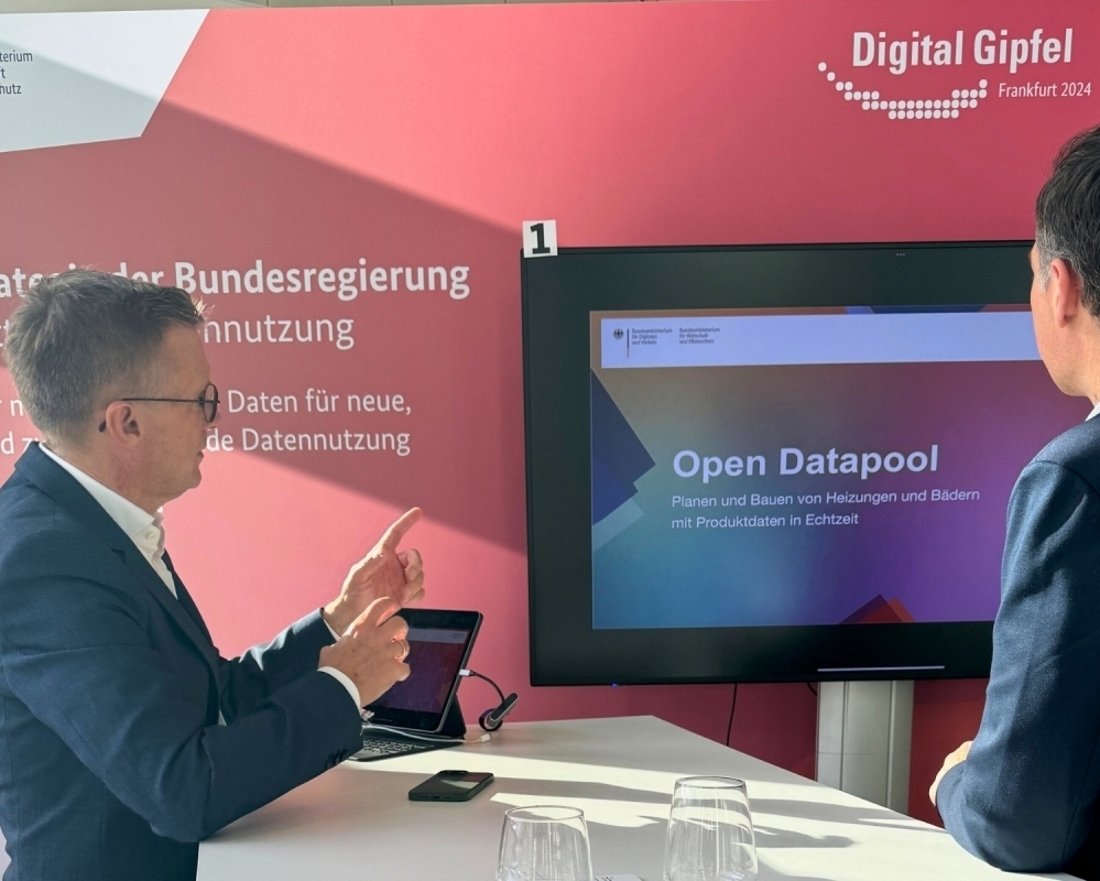 28.10.2024Auf dem Digital-Gipfel in Frankfurt mit über 1.500 Vertretern aus Politik, Wirtschaft, Wissenschaft und Gesellschaft wurden am 21. und 22. Oktober 2024 Lösungen für die digitale Transformation in Deutschland vorgestellt und diskutiert. An den zwei Tagen standen Bundesregierung und Digitalisierungsexperten unterschiedlicher Branchen im direkten Dialog. Zu den Projekten, die auf dem Digital-Gipfel präsentiert wurden, gehörte die Datenplattform Open Datapool. Diese wurde vom Zentralverband Sanitär Heizung Klima (ZVSHK) gemeinsam mit dem Deutschen Großhandelsverband Haustechnik e.V. (DG Haustechnik), dem Bundesverband Software und Digitalisierung e. V. (BVBS) und der ITEK GmbH entwickelt und implementiert.