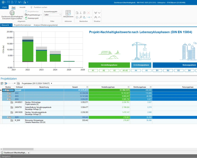 Nachhaltigkeitswerte können in „RIB iTWO“ definiert und den einzelnen Prozessen in unterschiedlichen Projektphasen zugeordnet und über das Datawarehouse projektübergreifend ausgewertet und analysiert werden.